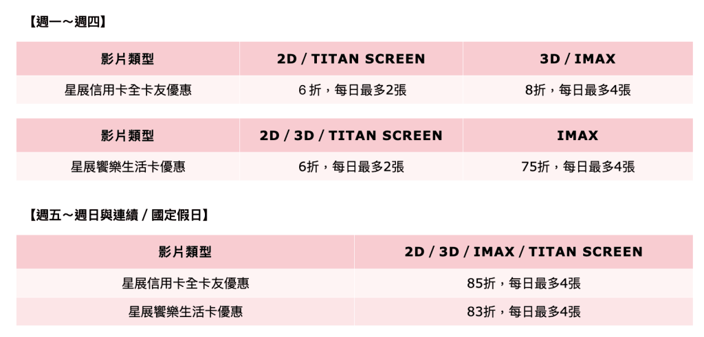 星展合併花旗消金之後,延續花旗的優惠,刷星展eco永續卡購買威秀影城電影票,天天優惠6折起,週一~週四最高6折,週五~週日最高83折。